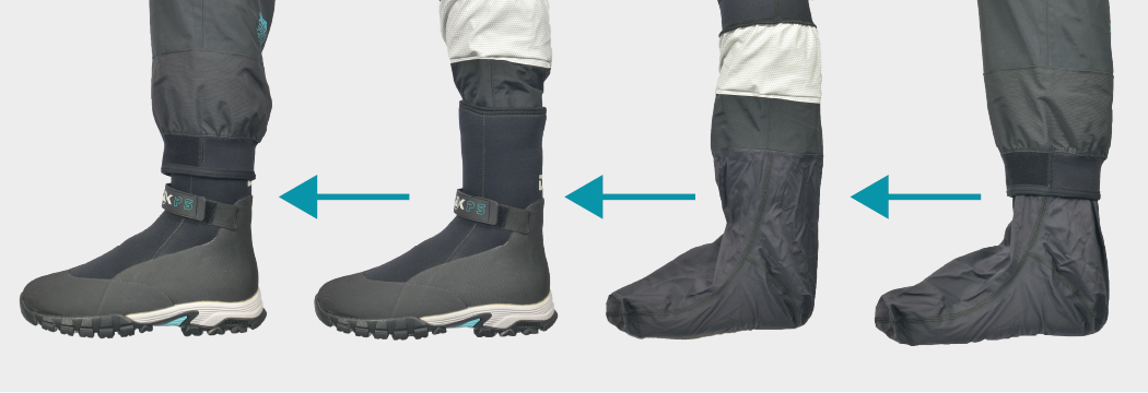 The long awaited DBS (Dry Boot System) Boots are designed to work in harmony with our legwear and One Piece Suits, the 30cm high ankle section slots neatly under the outer ankle seal on our legwear - in turn creating an ankle sandwich system if you will.
