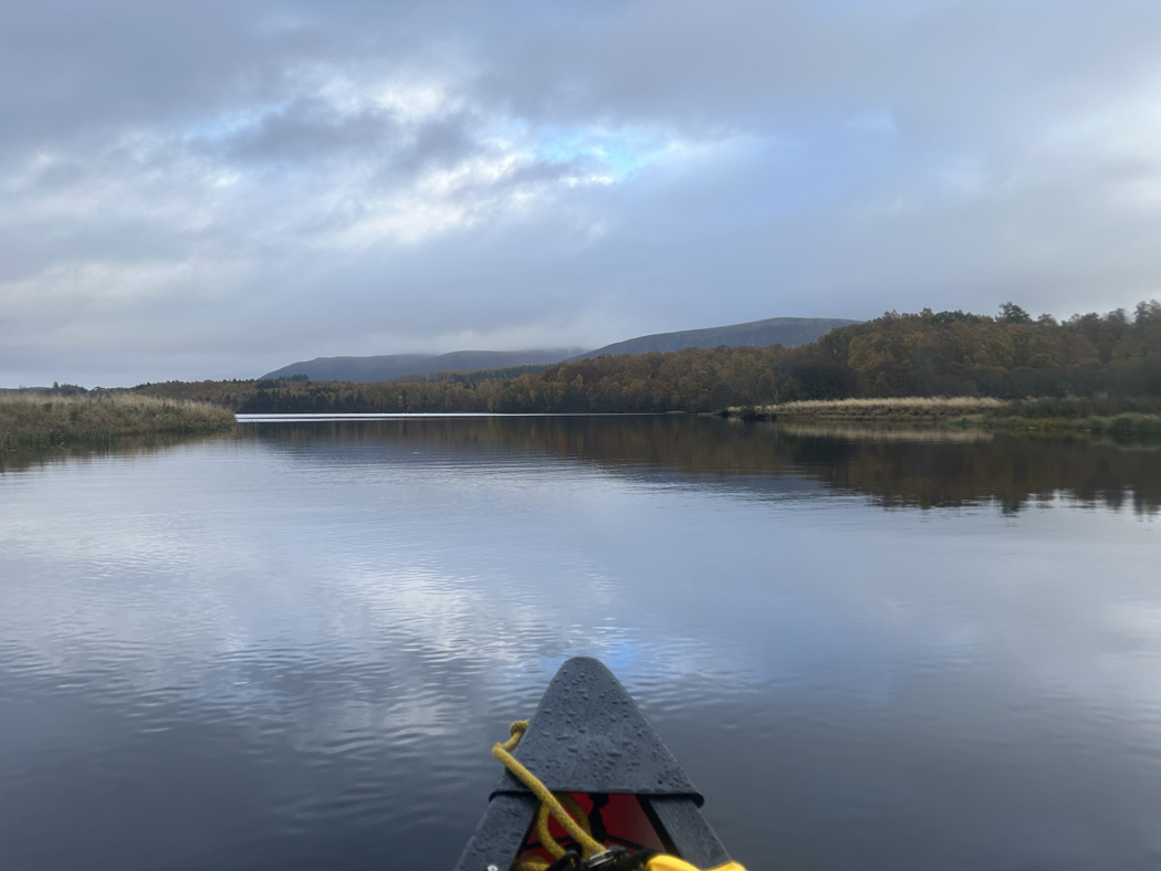 The first day was difficult – this was such a new skill for both my friend, Laura, and me – but Stephen was patient and began teaching us the first of many new skills we would acquire. It was also raining and extremely cold, which were not exactly ideal conditions. For me, the sound of the paddle on the hull was very distracting, but soon we came to another piece of stunning scenery, and the noise gradually faded into the background. Nests of birds sat atop autumn trees, and the low light of the sun tipped the leaves to gold.We passed through Loch Insh and along relatively flat sections of the river.